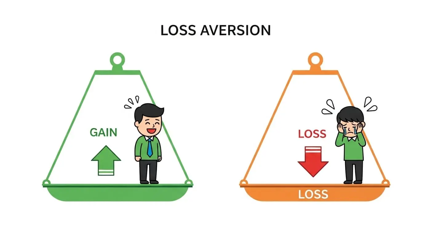 주식 시장에서 이득보다 손실을 훨씬 더 크게 느끼는 '손실 회피 편향'을 시각적으로 나타낸 이미지입니다.